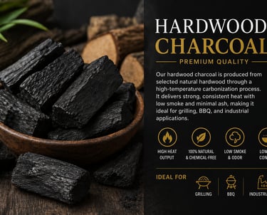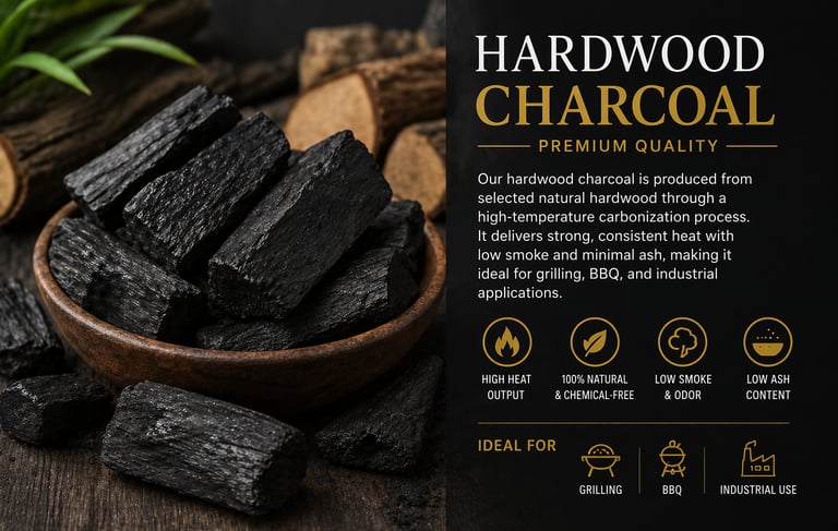 Premium hardwood charcoal is produced through a controlled carbonization process using selected natural wood. It delivers high calorific value, strong and consistent heat, and low smoke emission. Ideal for professional grilling and industrial use, it enhances flavor while ensuring efficient and clean combustion.