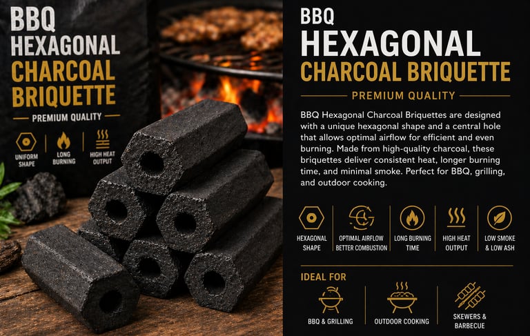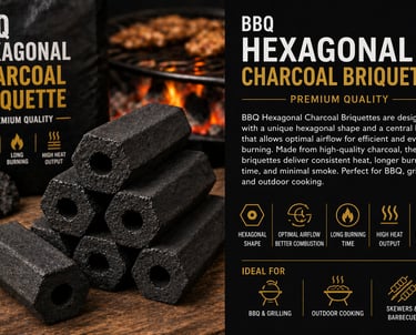 Designed with a central airflow channel, hexagonal briquettes optimize combustion efficiency and heat distribution. They burn longer and more consistently, making them a preferred choice for high-performance grilling and outdoor cooking.