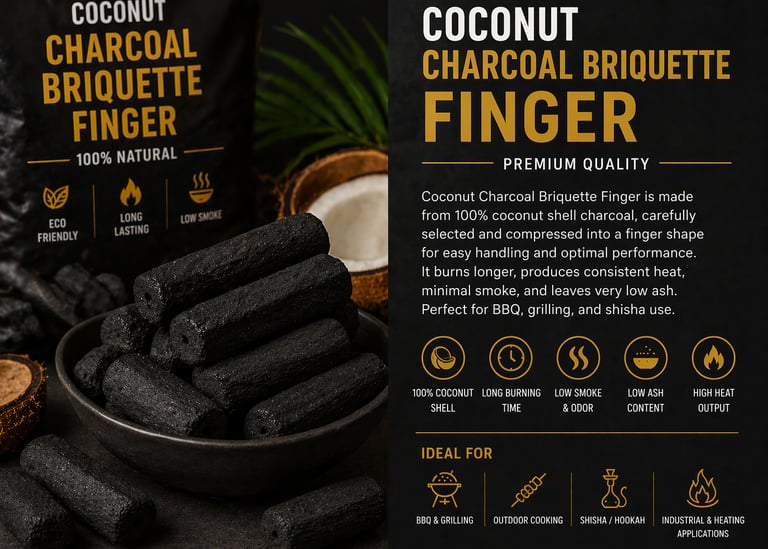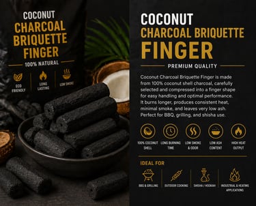 Made from premium coconut shells, finger briquettes offer a compact, high-density structure that ensures longer burn time and consistent heat. With low smoke and minimal odor, they are suitable for both BBQ and shisha applications.