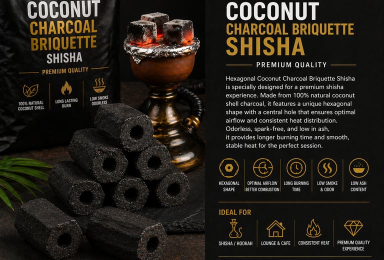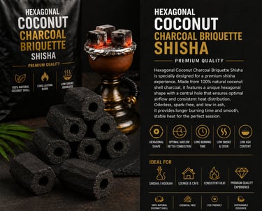 Specially developed for premium shisha use, these hexagonal briquettes provide superior airflow and stable heat control. Produced from 100% coconut shell charcoal, they are odorless, spark-free, and deliver a long-lasting, clean smoking experience.