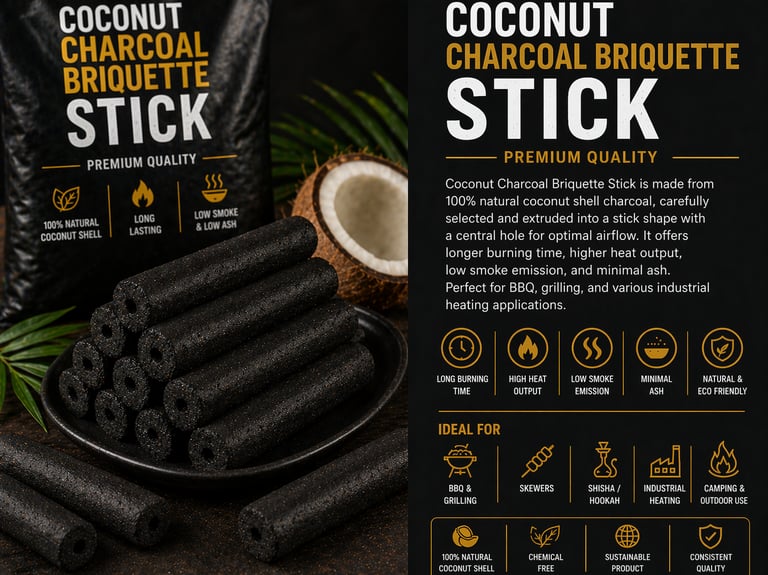 Stick briquettes offer extended burning performance with excellent heat consistency. Manufactured from high-quality coconut shells, they provide high energy efficiency, low smoke emission, and are ideal for BBQ and industrial heating applications.