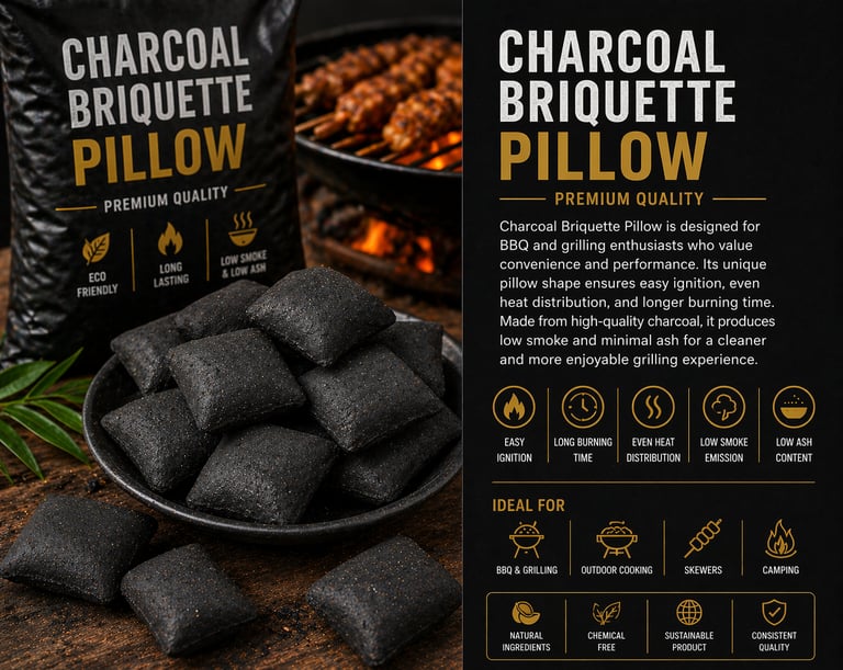 Pillow-shaped briquettes are engineered for easy ignition and even heat distribution. Their consistent performance and cost efficiency make them an ideal solution for large-scale BBQ operations and everyday grilling needs.