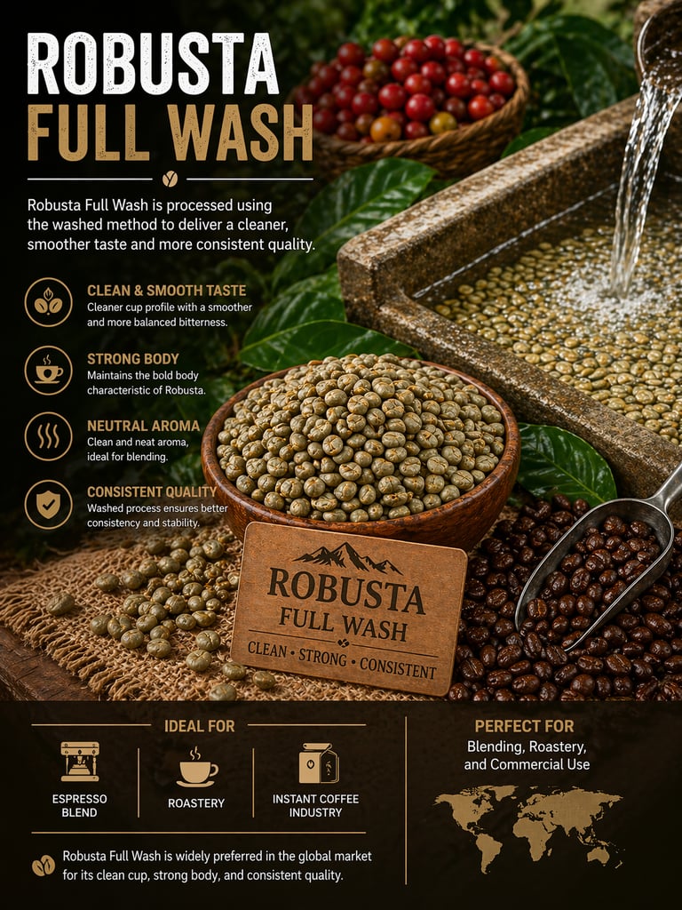 Robusta Full Wash is a premium coffee processed using the washed method, where the outer skin and mucilage are removed through fermentation and water cleaning. This process produces a cleaner, smoother taste with a more balanced bitterness, while maintaining the strong body typical of Robusta. It is ideal for espresso blends and widely preferred for consistent quality in international markets.