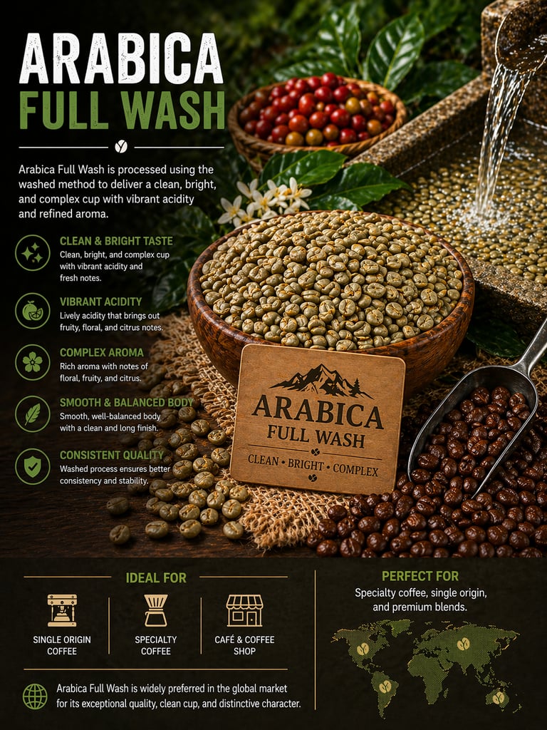 Arabica Full Wash is a premium coffee processed using the washed method, where the beans are fermented and thoroughly cleaned to remove mucilage before drying. This process results in a clean, bright, and complex flavor profile with vibrant acidity, smooth body, and a refined aroma. It is highly valued in the global market, especially for specialty coffee and single origin offerings.