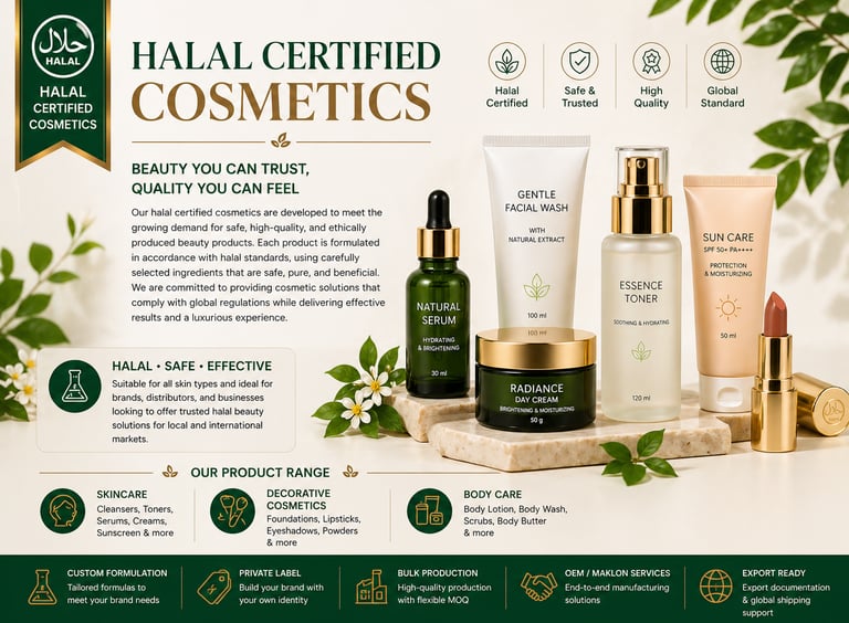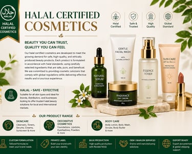Our halal certified cosmetics are developed to meet the growing demand for safe, high-quality, and ethically produced beauty products. Each product can be formulated according to halal standards, using carefully selected ingredients that are suitable for both local and international markets. This category includes skincare, decorative cosmetics, and body care products, making it ideal for brands, distributors, and businesses looking to offer trusted halal beauty solutions.