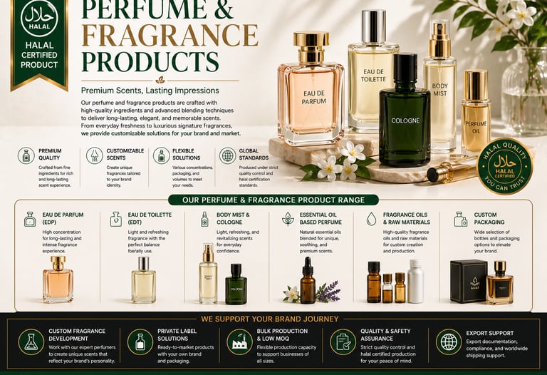 Our perfume and fragrance products are crafted to deliver long-lasting, memorable, and premium scent experiences. This category includes Eau de Parfum, Eau de Toilette, body mist, cologne, essential oil-based perfumes, fragrance oils, and raw materials. Products can be customized based on scent profile, packaging, concentration, and branding needs, making them suitable for private label, bulk supply, and international fragrance businesses.