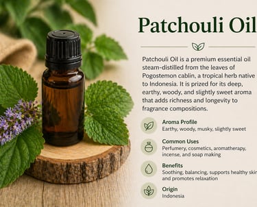 Patchouli Oil is a rich, earthy essential oil extracted from the leaves of the patchouli plant. Known for its deep, woody, and slightly sweet aroma, it is widely used in perfumery as a base note due to its long-lasting scent. In addition to fragrance applications, patchouli oil is valued in cosmetics and aromatherapy for its soothing, anti-inflammatory, and skin-regenerating properties.