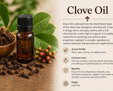 Clove Oil is derived from the dried flower buds of the clove tree and is recognized for its strong, warm, and spicy aroma. It contains high levels of eugenol, making it highly effective for antimicrobial and antiseptic purposes. This oil is commonly used in oral care products, pharmaceuticals, and as a key ingredient in spicy and oriental fragrance compositions.