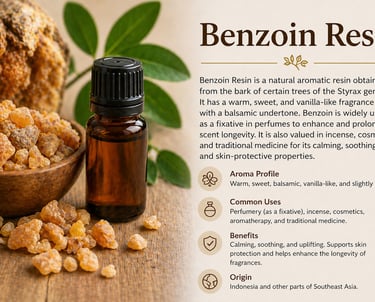 Benzoin Resin is a natural aromatic resin obtained from the bark of certain trees. It has a warm, sweet, vanilla-like fragrance and is commonly used as a fixative in perfumes to enhance longevity. Benzoin is also valued in incense, cosmetics, and traditional medicine for its calming and skin-protective properties.